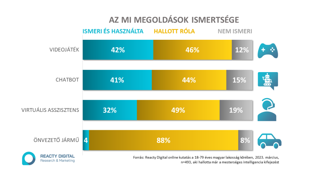 Az MI körüli bizonytalanságot jól mutatja, hogy a fogalomnál a konkrét megoldások ismertebbek, bár azokról sokszor nem is tudatosul a felhasználóikban, hogy mesterséges intelligencia áll a hátterükben. Legnagyobb arányban a videójátékozás kapcsán találkozott MI-vel a lakosság, a fogalmat legalább hallomásból ismerők közül tízből négyen játszottak már a gép ellen, és kilencen hallottak már erről a lehetőségről. Chatbotokat, virtuális asszisztenseket, beszéd- és képfelismerő szoftvereket is 30-40% használt már, jóllehet ebben nincs is mindig választási lehetőségünk, például amikor egy ügyfélszolgálaton egy chatbot válaszol. A legismertebb, ugyanakkor az exkluzivitása miatt a legkevésbé használt MI megoldás az önvezető jármű – 92% hallott erről a megoldásról, de csak 4% ült eddig ilyen autóban.